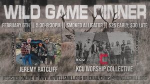 We look forward to seeing you at this year’s Wild Game Dinner! We’re looking forward to smoking some whole gators and worshiping with you all. If you have any questions, feel free to call the office or email Chris at chris@howellsmill.org